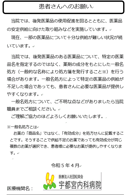 一般名処方について、ご不明な点などがありましたら当院職員までご相談ください。